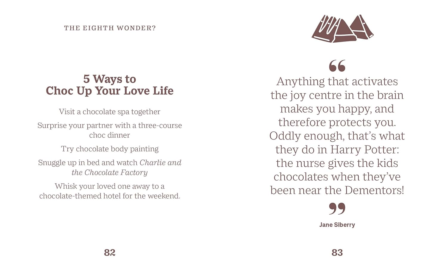 From the purest chocolates to the most bizarre flavors you can find and from the everyday to the decadent, this book is a light-hearted celebration of the history, taste and culture of chocolate. There are facts and statistics, amusing sayings, proverbs and puns, as well as quotations from the great and the good all about chocolate, why it's so nice and how best to consume it. Dip in to a few pages of this and you'll soon be reaching out for a slab of brown (or white) heaven in your hand!