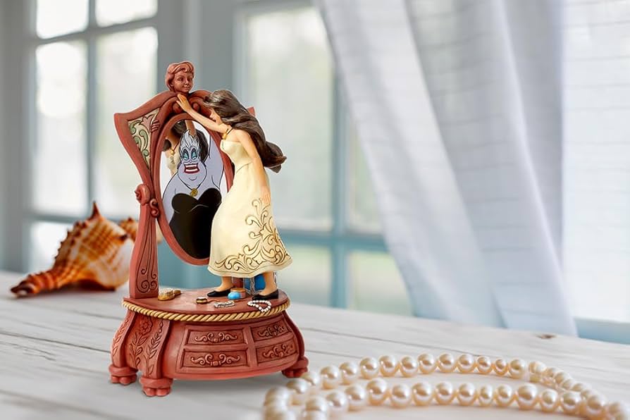 In this bewitching piece by Jim Shore, Ursula, the seawitch, is depicted in her human form, transfixed as she gazes into a mirror that unveils her true nature. In exquisite detail, the scene captures the villain in a transformative moment.