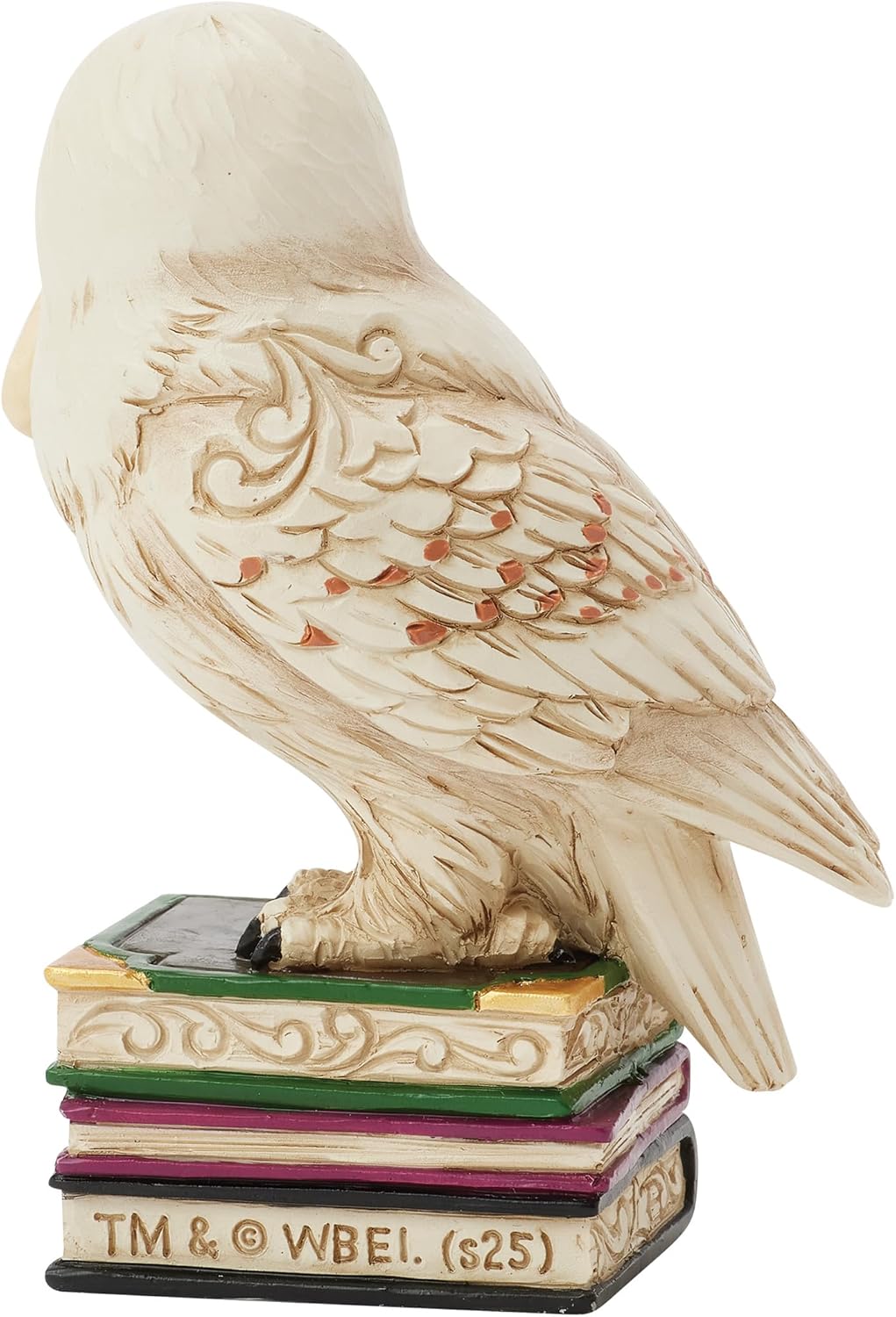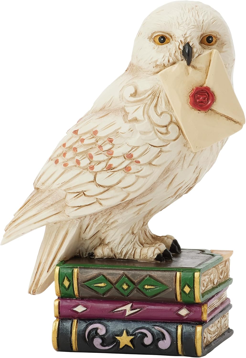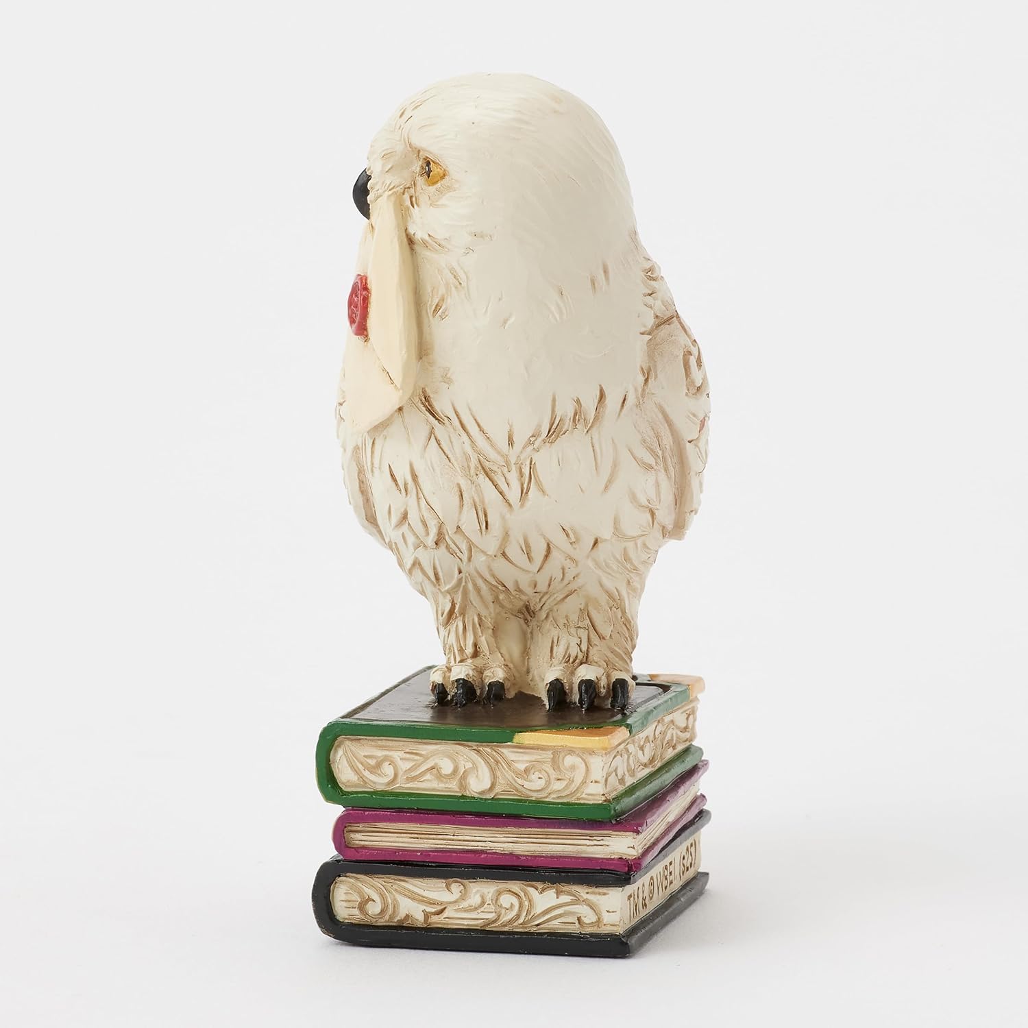 From enesco, Jim SHORE comes the White Owl Hedwig figure from Harry Potter It depicts a Hedwig on a hedwig with a letter on top of a bunch of books.