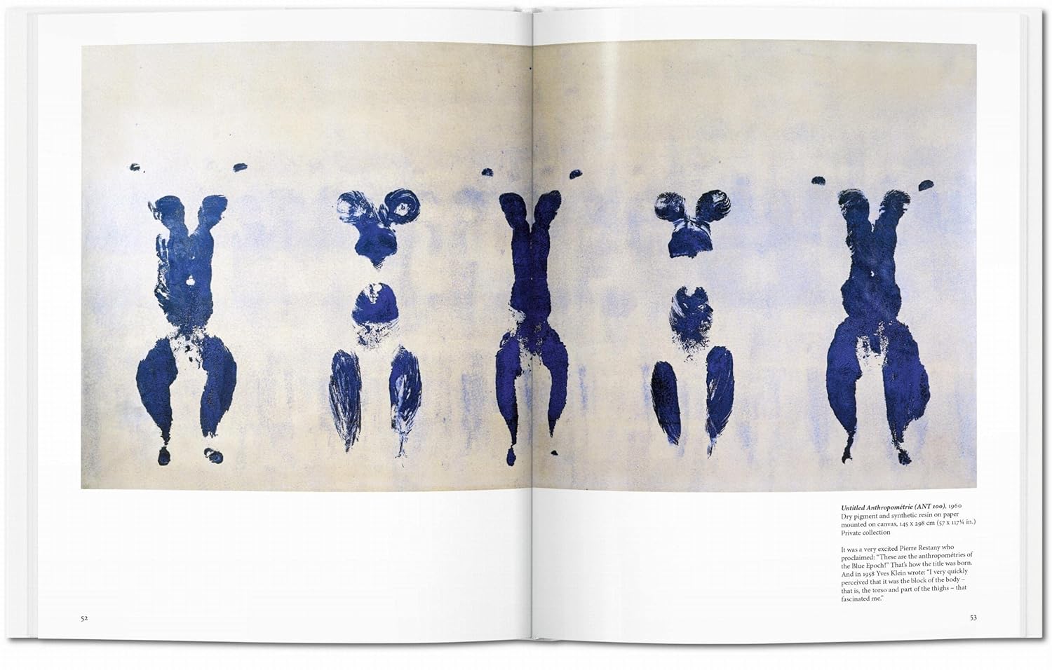 In the mid-1950s, Yves Klein (1928–1962) declared that “a new world calls for a new man.” With his idiosyncratic style and huge charisma, this bold artist would go on to pursue a brief but bountiful career, producing more than 1,000 paintings over seven years in an oeuvre now considered a mainstay of postwar modernism.Klein made his name above all with his large monochrome canvases in his own patented hue of blue. International Klein Blue (IKB), composed of pure pigment and binding medium, is at once rich and luminous, evocative and decorative, and was conceived by Klein as a means of evoking the immateriality and infinitude of the world. The works of this “Blue Revolution” seem to draw us into another dimension, as if hypnotized by a perfect summer sky. Klein was also renowned for his deployment of “living brushes,” in which naked women, daubed in International Klein Blue, would make imprints of their bodies on large sheets of paper. This Basic Art introduction presents key Klein works to introduce an artist who was at once a showman, inventor, and pioneer of performance art. With page after page of the ever-alluring International Klein Blue, it is both an essential guide to a modern art master and a meditation on the unique effects of a single color.