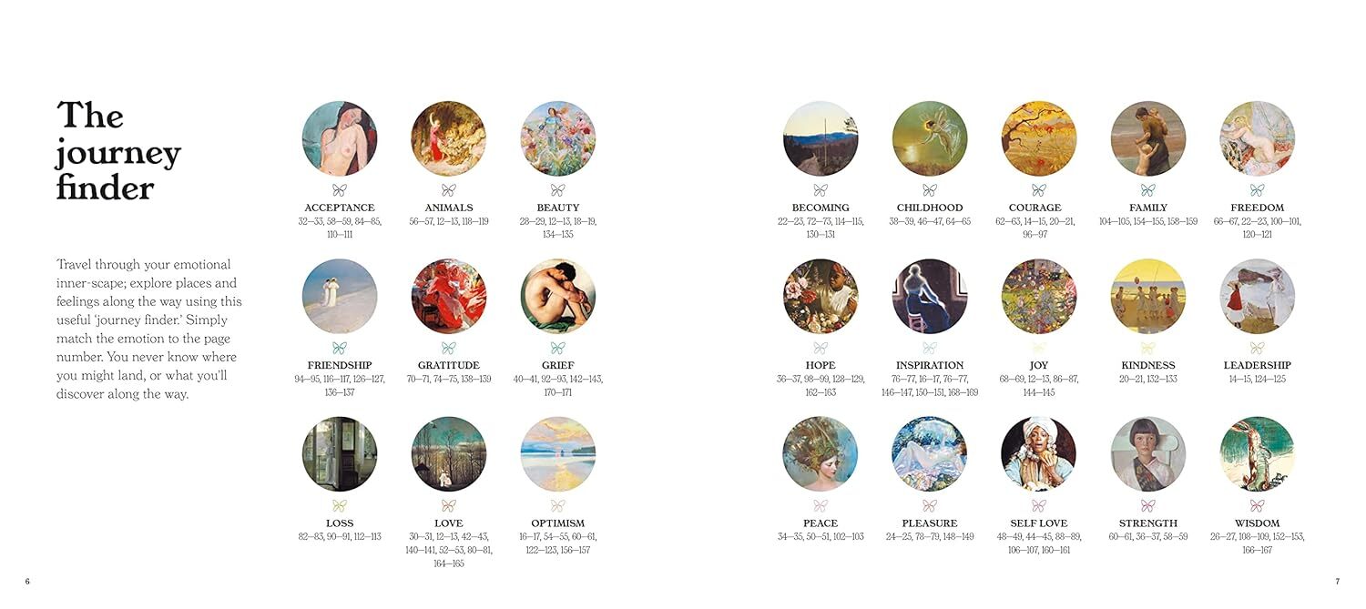 The contents page is artfully divided into 24 emotional journeys that suggest routes in which to navigate the book to explore different feelings along the way, and to provide comfort and solace in difficult times. Within these pages you will find both the works of world-renowned masters and the paintings of lesser-known talents paired with uplifting thoughts from great poets, writers and thinkers. A biographical section on the featured artists will provide context on your new favourite finds