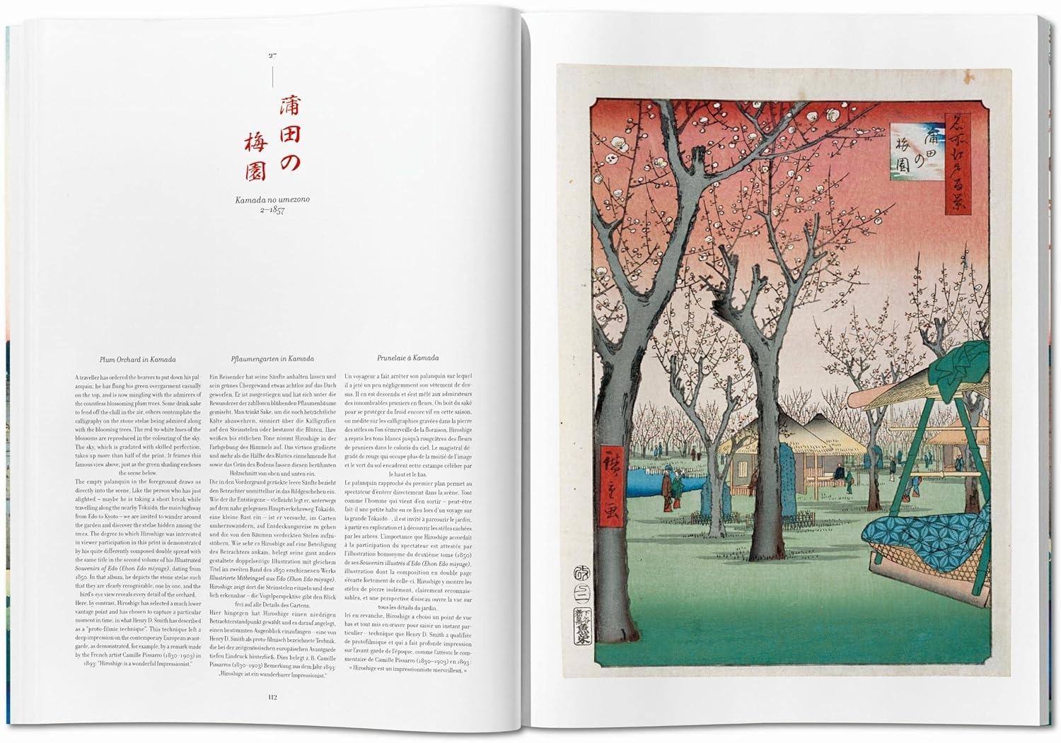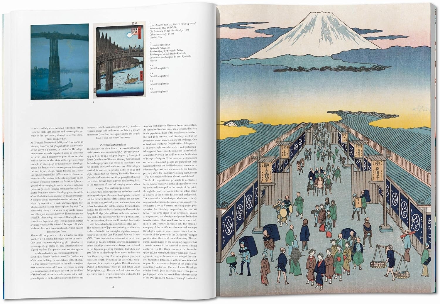 Utagawa Hiroshige (1797–1858) was one of the last great artists in the ukiyo-e tradition. Literally meaning “pictures of the floating world,” ukiyo-e was a particular genre of art that flourished between the 17th and 19th centuries and came to characterize the Western world’s visual idea of Japan. In many ways images of hedonism, ukiyo-e scenes often represented the bright lights and attractions of Edo (modern-day Tokyo): beautiful women, actors and wrestlers, city life, and spectacular landscapes.Though he captured a variety of subjects, Hiroshige was most famous for landscapes, with a final masterpiece series known as “One Hundred Famous Views of Edo” (1856–1858), which depicted various scenes of the city through the seasons, from bustling shopping streets to splendid cherry orchards.This reprint, bound in the traditional Japanese fashion, is made from one of the finest complete original sets of woodblock prints belonging to the Ota Memorial Museum of Art in Tokyo. It pairs each of the 120 illustrations with a description, allowing readers to immerse themselves in these beautiful, vibrant vistas that became paradigms of Japonisme and inspired Impressionist, Post-Impressionist and Art Nouveau artists alike, from Vincent van Gogh to James McNeill Whistler.