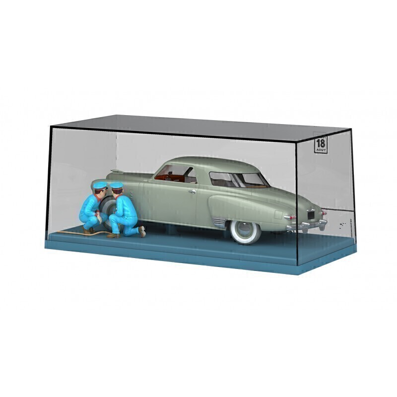 For the purposes of their investigation, the Smiths have infiltrated the Simoun car repair company. Here they are relegated to the maintenance of vehicles. Very attentive to the words of the director of the company, Dupond forgets the pressure of the tyre he is inflating, and it ends up bursting... Although Hergé only depicted it in part, the Simoun director's car is perfectly identifiable. From the two radiator emblems, the one-piece windscreen and the three sections of the grille, it is a Studebaker Commander Regal De Luxe coupé dating from 1947.