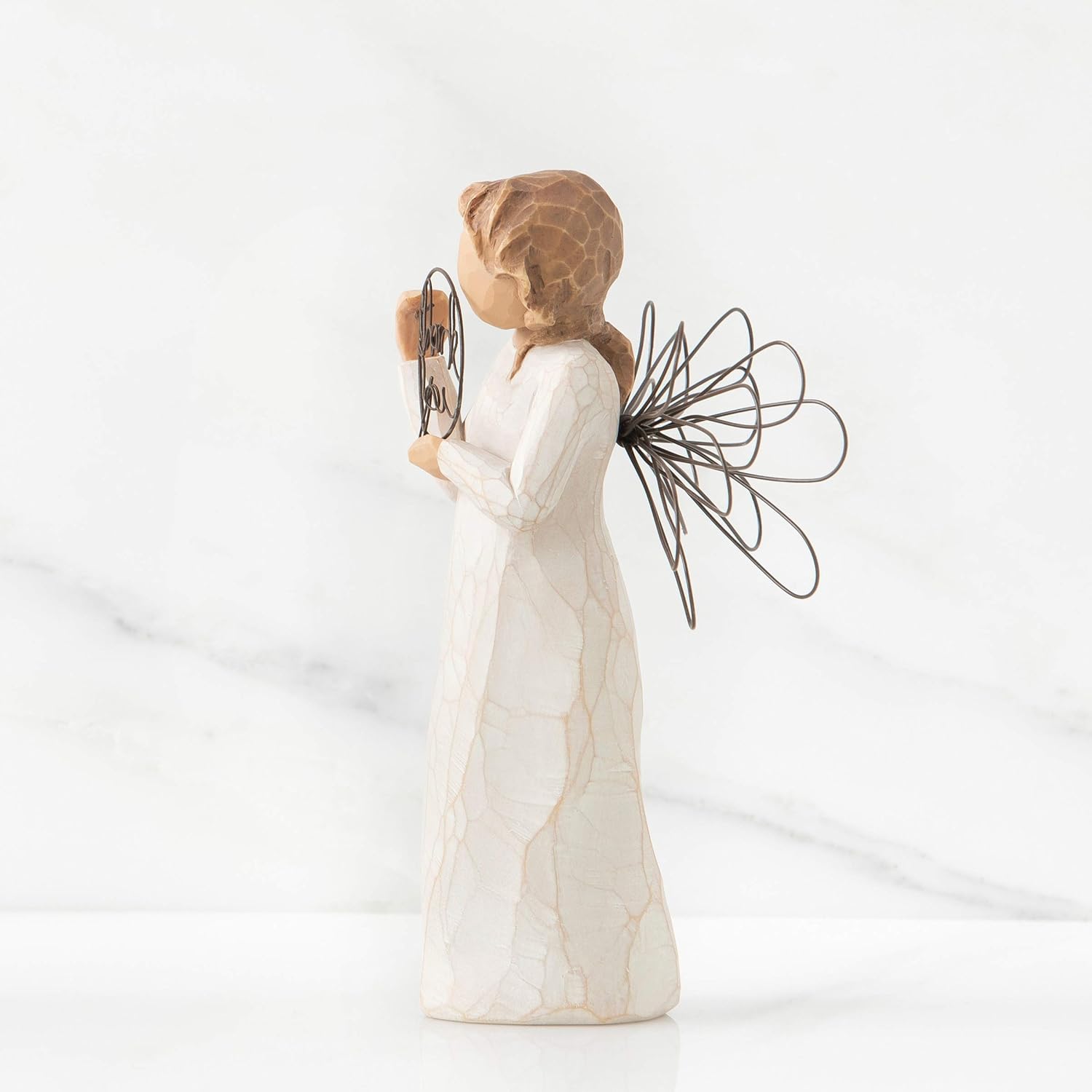 TITLE: Just for You SENTIMENT: With sincere thanks GIFT-GIVING SUGGESTIONS: A gift to express appreciation and thankfulness for teachers, volunteers, donors, caregivers, friends. Willow Tree angels resonate with many cultures and ages of people. To some they represent protection, to some they are an outward reminder of inner peace, and to some they represent a way to remember those who have left this earth. Hand-carved figures reveal their expression through body gestures only... a tilt of the head, placement of the hands, a turn of the body. Since 1999, American artist Susan Lordi has worked in partnership with DEMDACO to produce, market and distribute Willow Tree , her line of carved figurative sculpture. From her studio in Kansas City, Lordi hand carves the original of each figure. This piece is cast from Lordi's original and painted by hand. Enclosed inside each fitted packaging box is a gift-giving card with piece title and sentiment on it. Each piece is intended to be open to interpretation from the viewer. "Willow Tree isn't so much about the tangible piece. It represents an emotion or it marks a memory." -Susan Lordi Ready to display on a shelf, table or mantel. To clean, dust with soft brush or cloth. Avoid water or cleaning solvents.